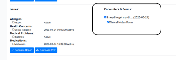 then in the Encounters and forms section, you can select the documents to print. Here, the pt only has one encounter, so just select those checkboxes and download the pdf,