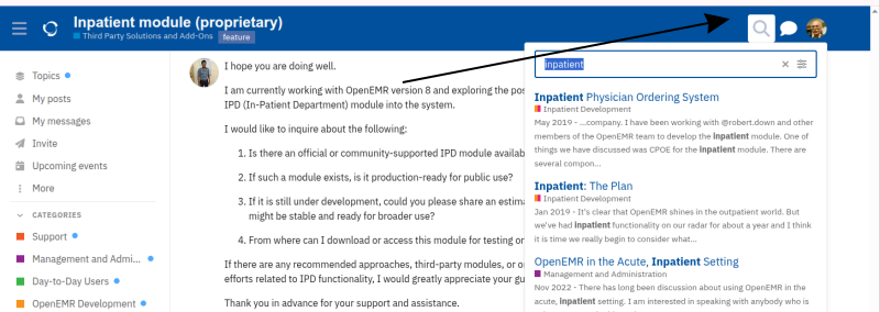 Try this: click the magnifying glass icon at the top right of your screen and enter a search term.