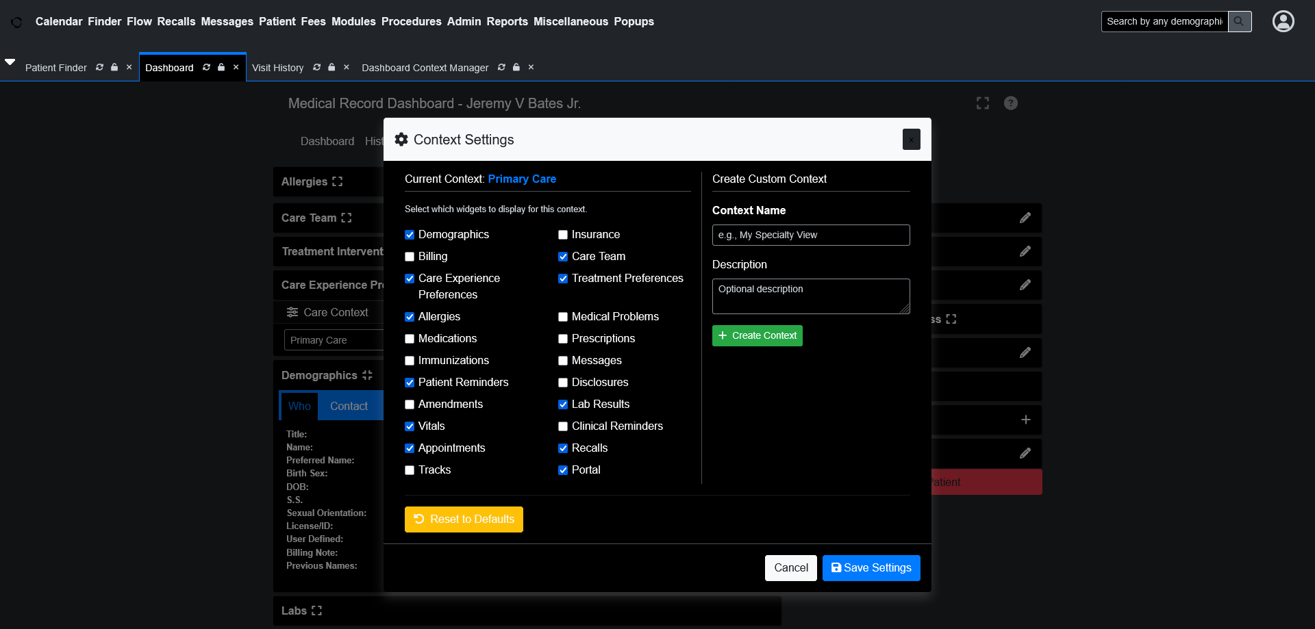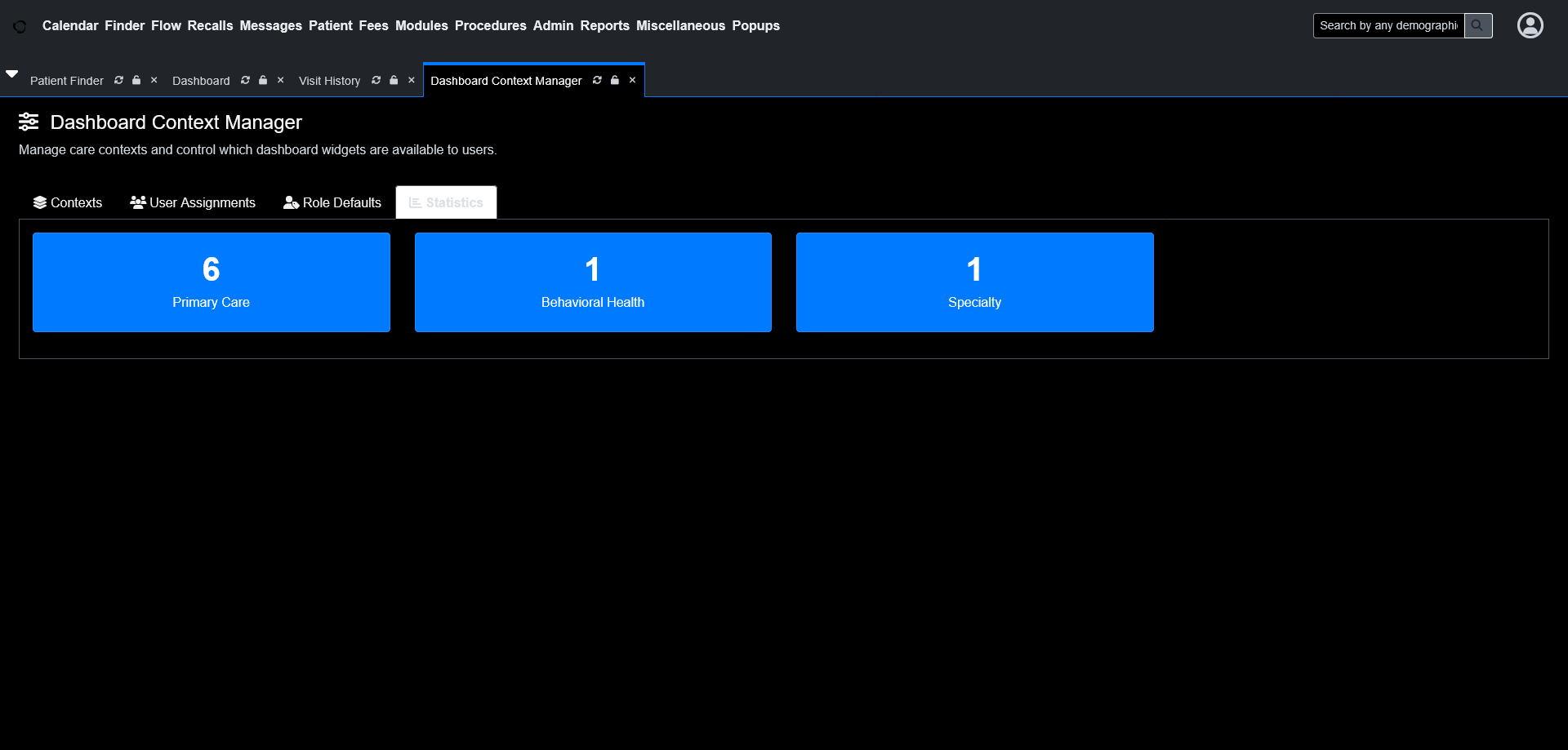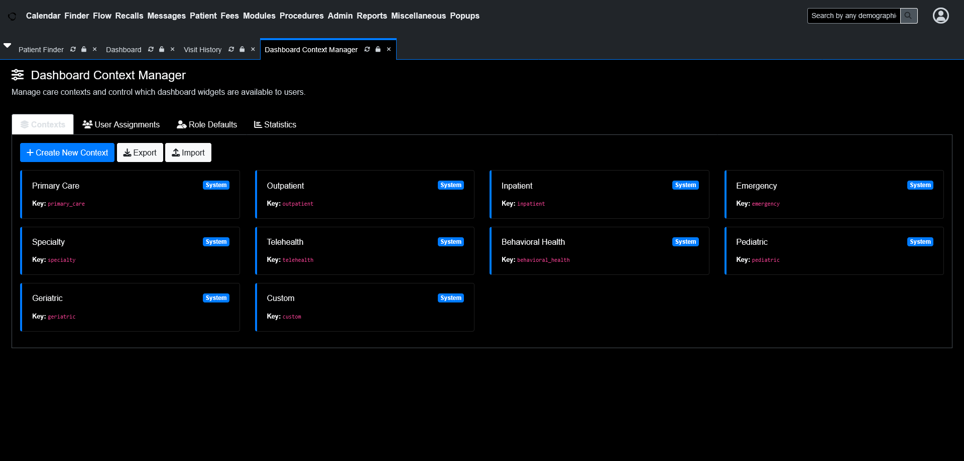 This module lets you switch between predefined “care contexts” that show only the widgets relevant to your current workflow.