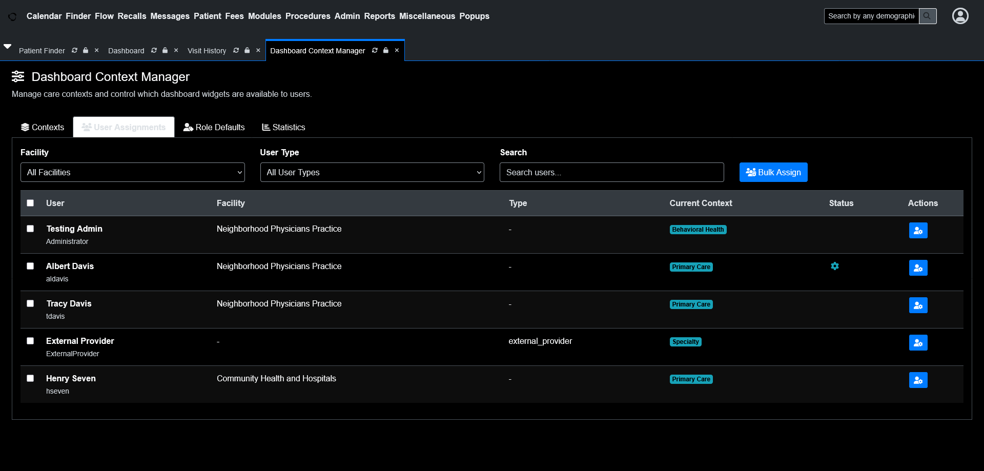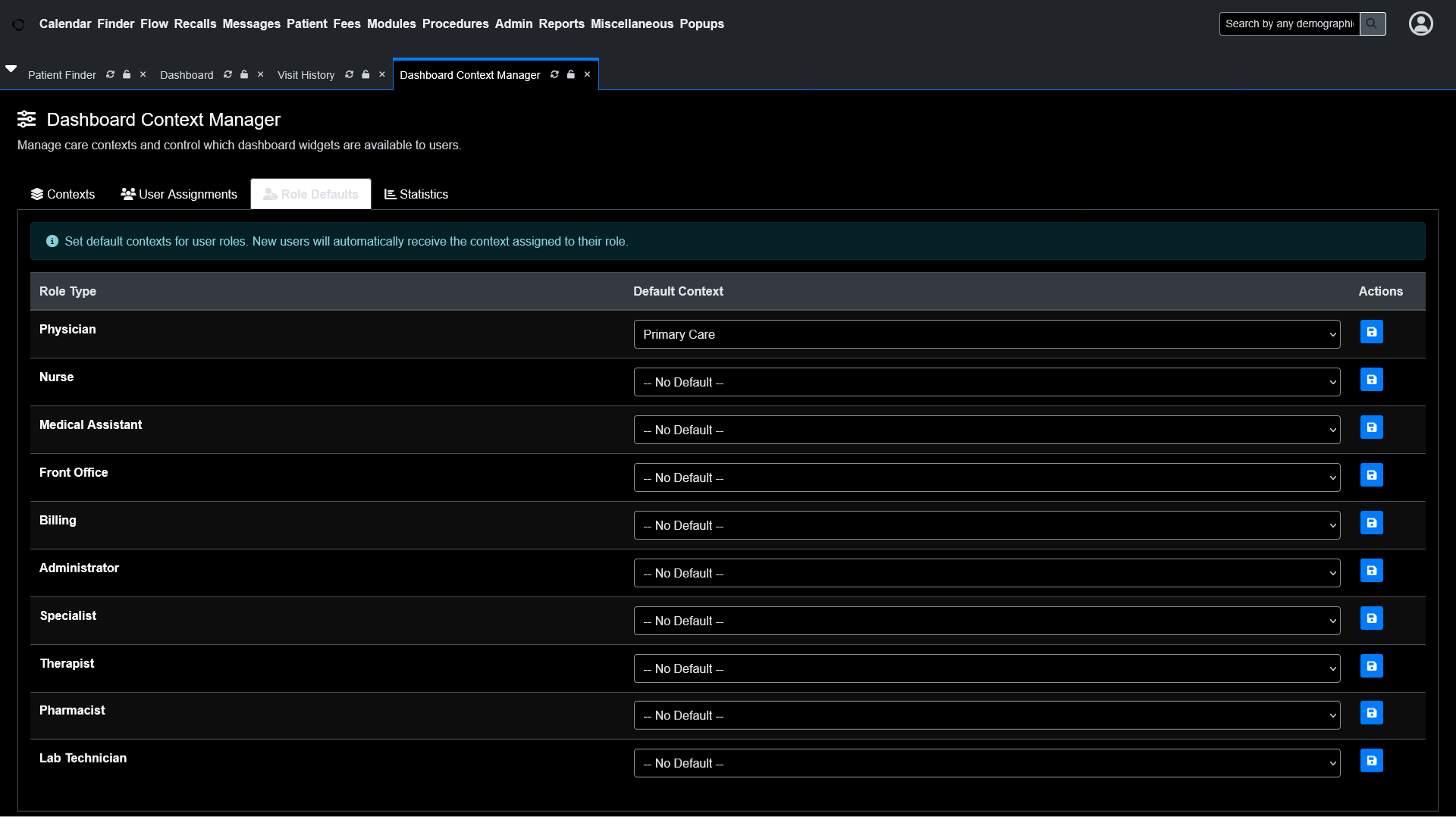 Admins can assign default contexts by user role, lock contexts when standardization matters, and manage settings across facilities.