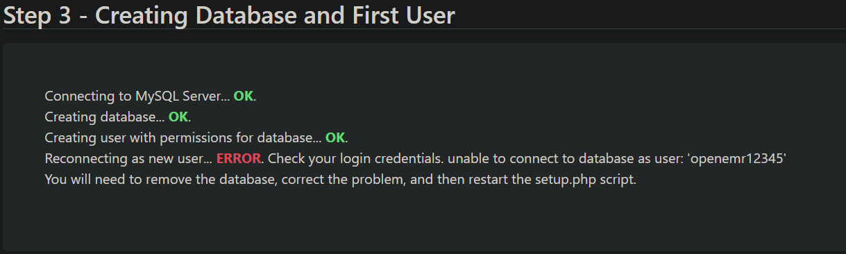 the issue is when I then try to docker-compose and using the image I have instead of openemr/openemr:7.0.3, it breaks and becomes unhealthy and doesnt work. If I change image to the openemr/openemr:7.0.3, it spins up just fine. I then tried changing mysqlconf.php $config = 0 (from 1), docker-compose now spins up and sends me to the installation wizard, and it connects to the database however cannot connect as user “openemr12345”.
