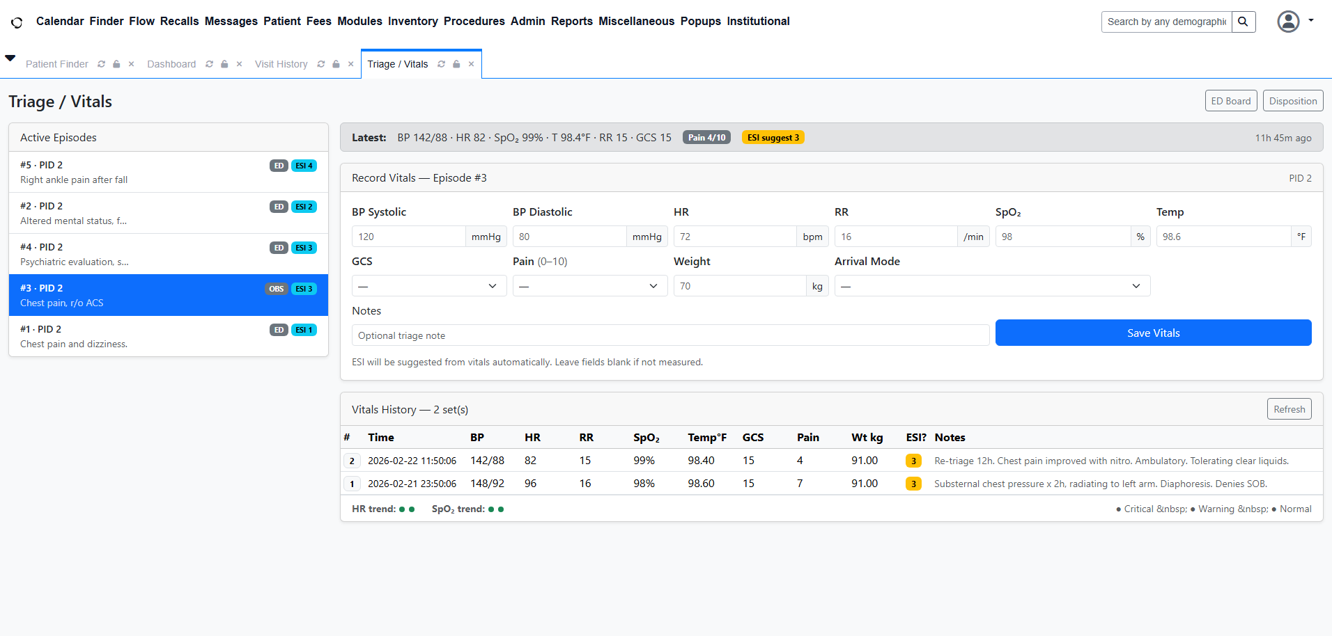 | Triage / Vitals | Multi-set vitals capture (BP, HR, RR, SpOâ‚‚, Temp, GCS, Pain, Weight) with automatic ESI suggestion, history table, trend indicators, and abnormal value highlighting. | Production |