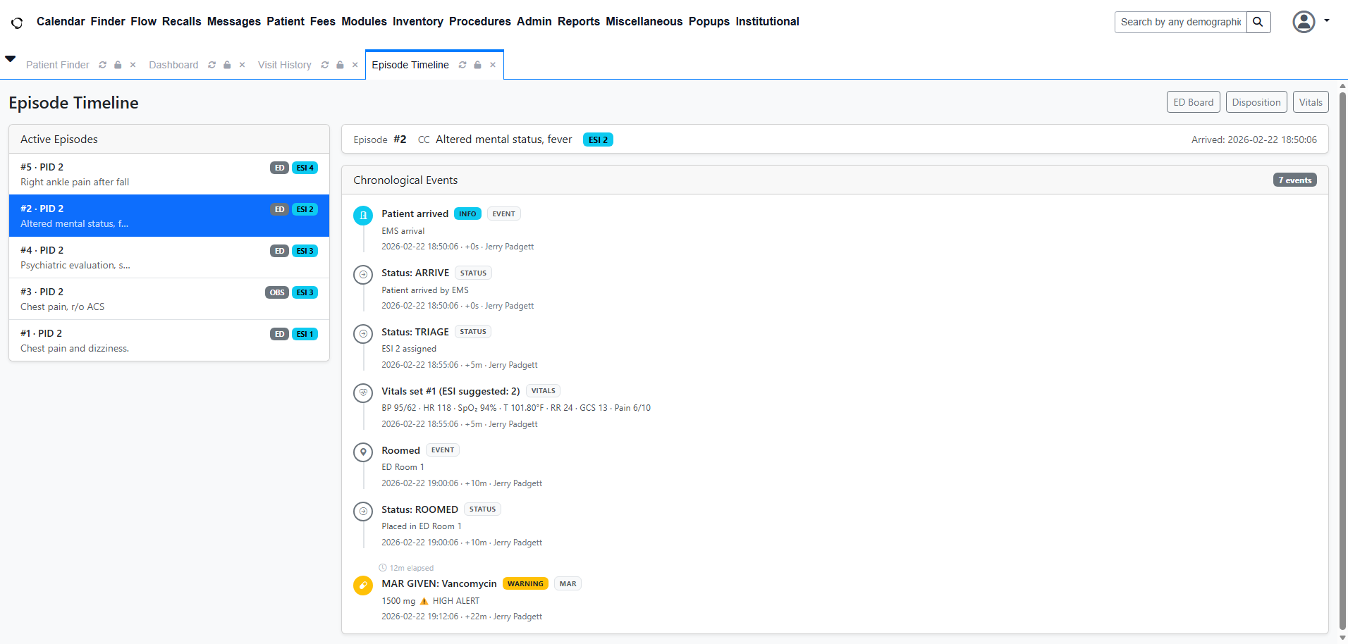 | Episode Intake | Patient search (name, DOB, phone, PID) with new episode creation, arrival mode, ESI entry, and chief complaint capture. | Production |
