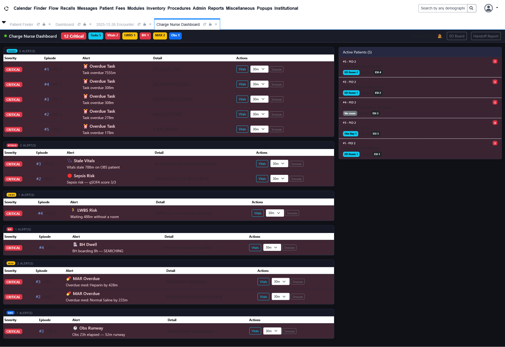 | Alerts Dashboard | Dark-mode charge nurse dashboard polling every 60s. Ten alert types: LWBS risk, overdue tasks, MAR overdue, BH boarding dwell, obs runway, vitals deterioration, stale vitals, no-vitals-on-arrival, sepsis risk (qSOFA), and OBS billing flags. Per-alert snooze. Web Audio API alert tone on new criticals. | Production |