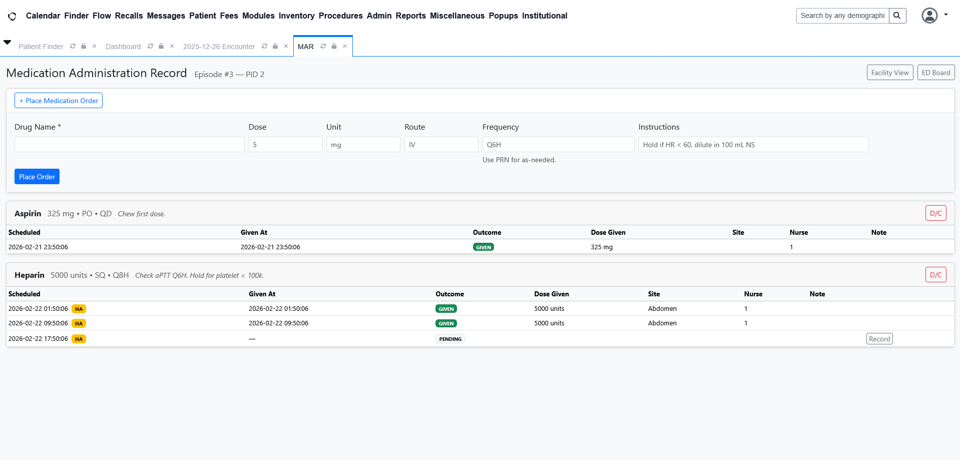 | MAR | Digital medication administration record. Order placement with high-alert drug detection (23 categories). Auto-scheduling from standard frequency codes (QD through Q12H). PRN orders. Inline outcome recording (GIVEN / HELD / REFUSED / MISSED). Facility-wide overdue panel. | Production |