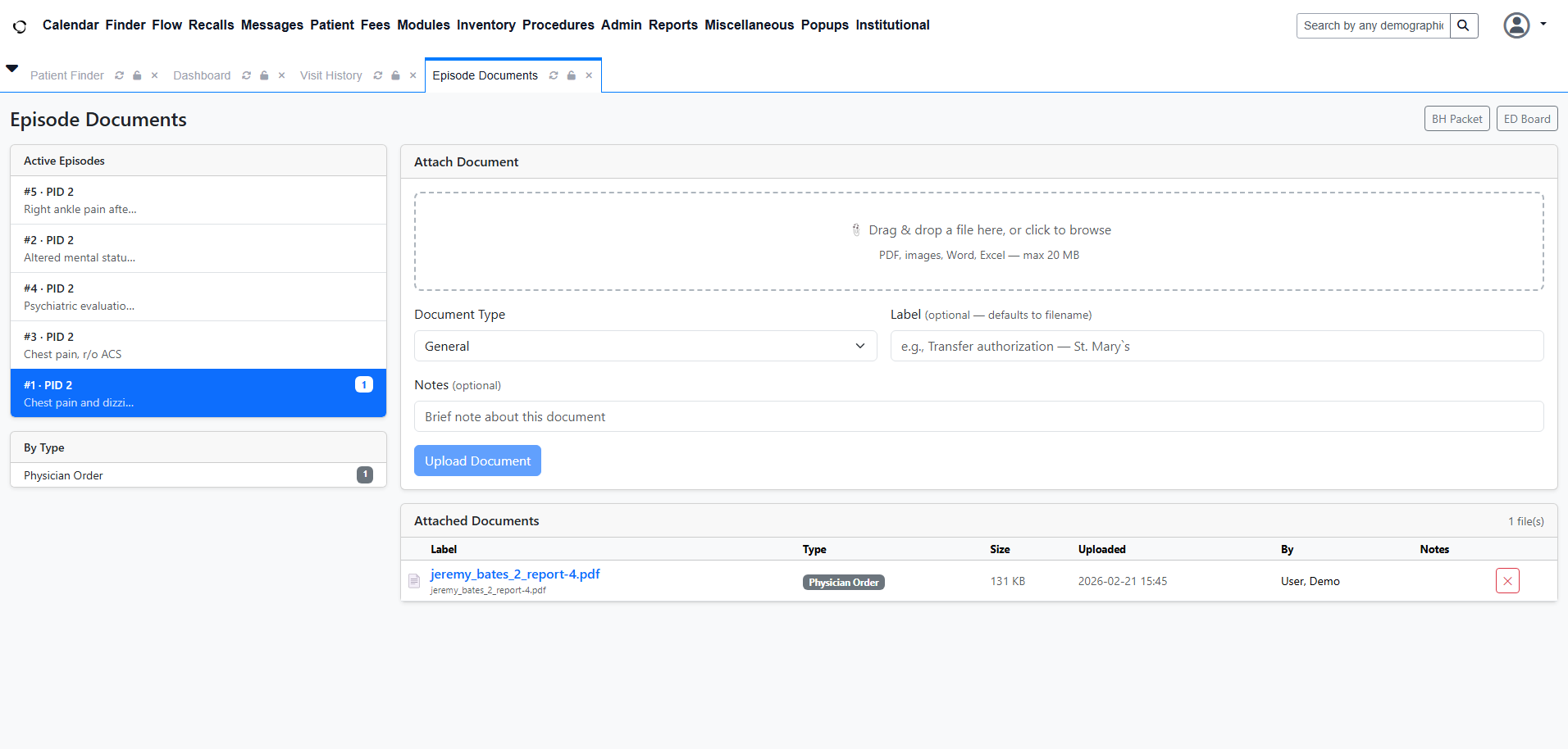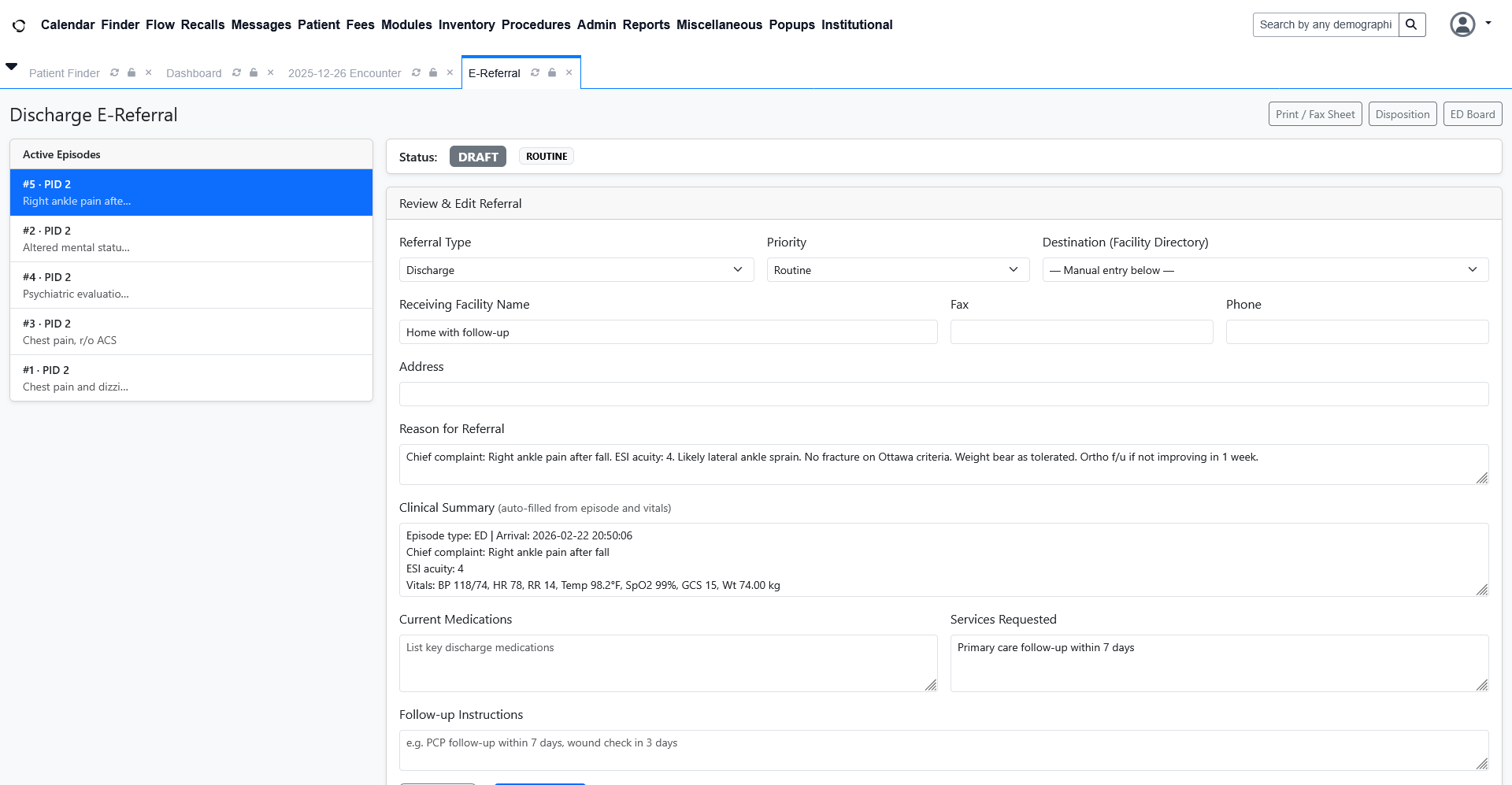 | E-Referral | Discharge referral auto-drafted from disposition. Priority auto-escalated for high-acuity transfers. Clinical summary pre-populated from vitals and chief complaint. Facility Directory fuzzy-matched. Full send/response workflow. Print / Fax Sheet. Supports Meaningful Use transitions-of-care attestation. | Production |