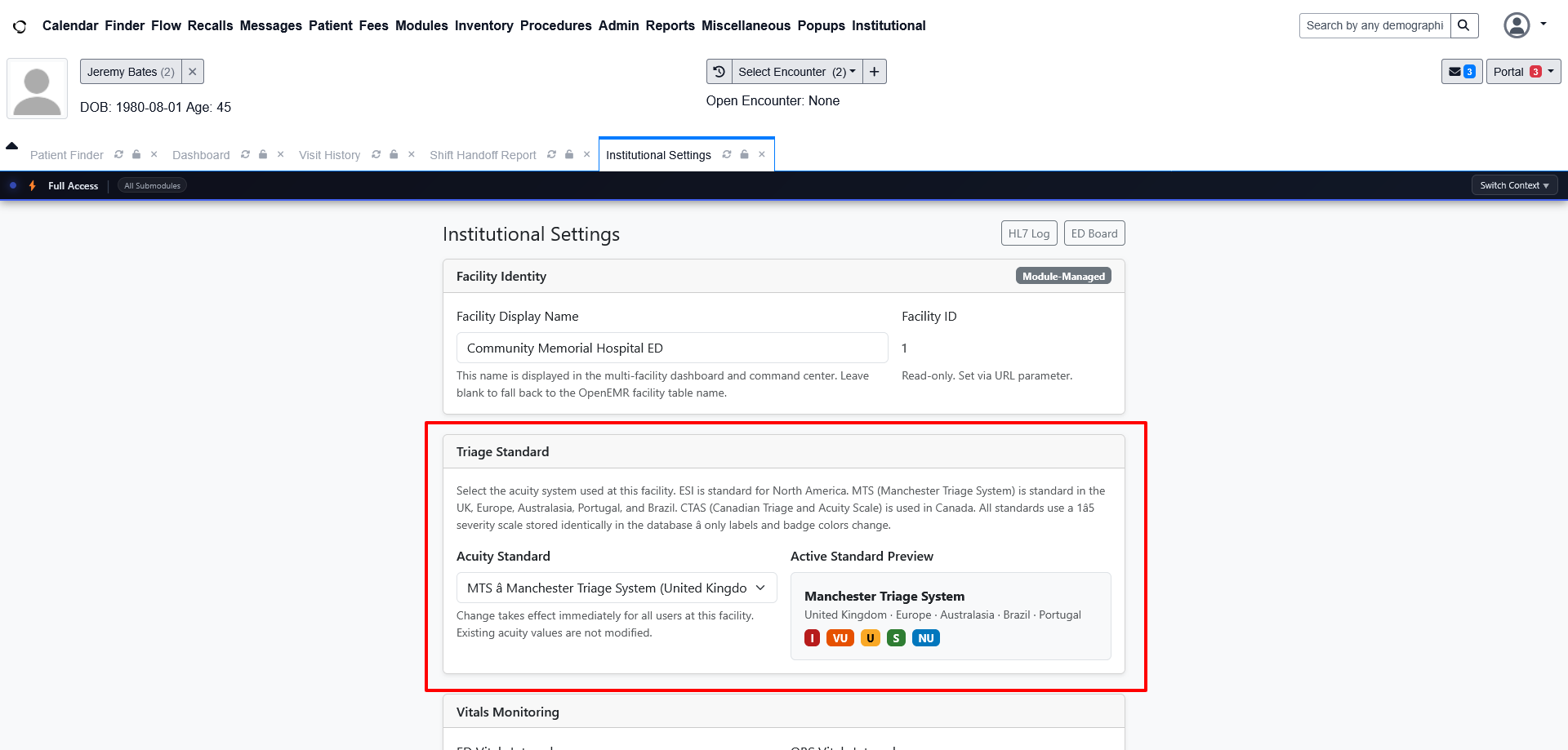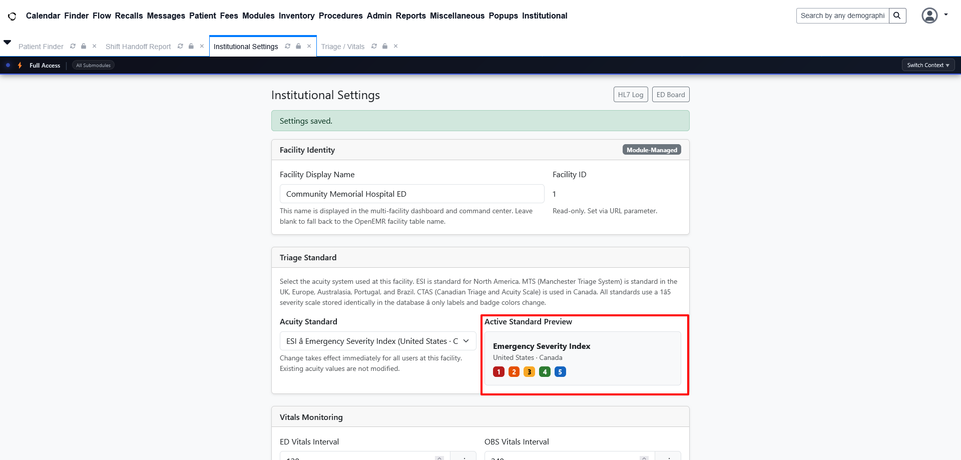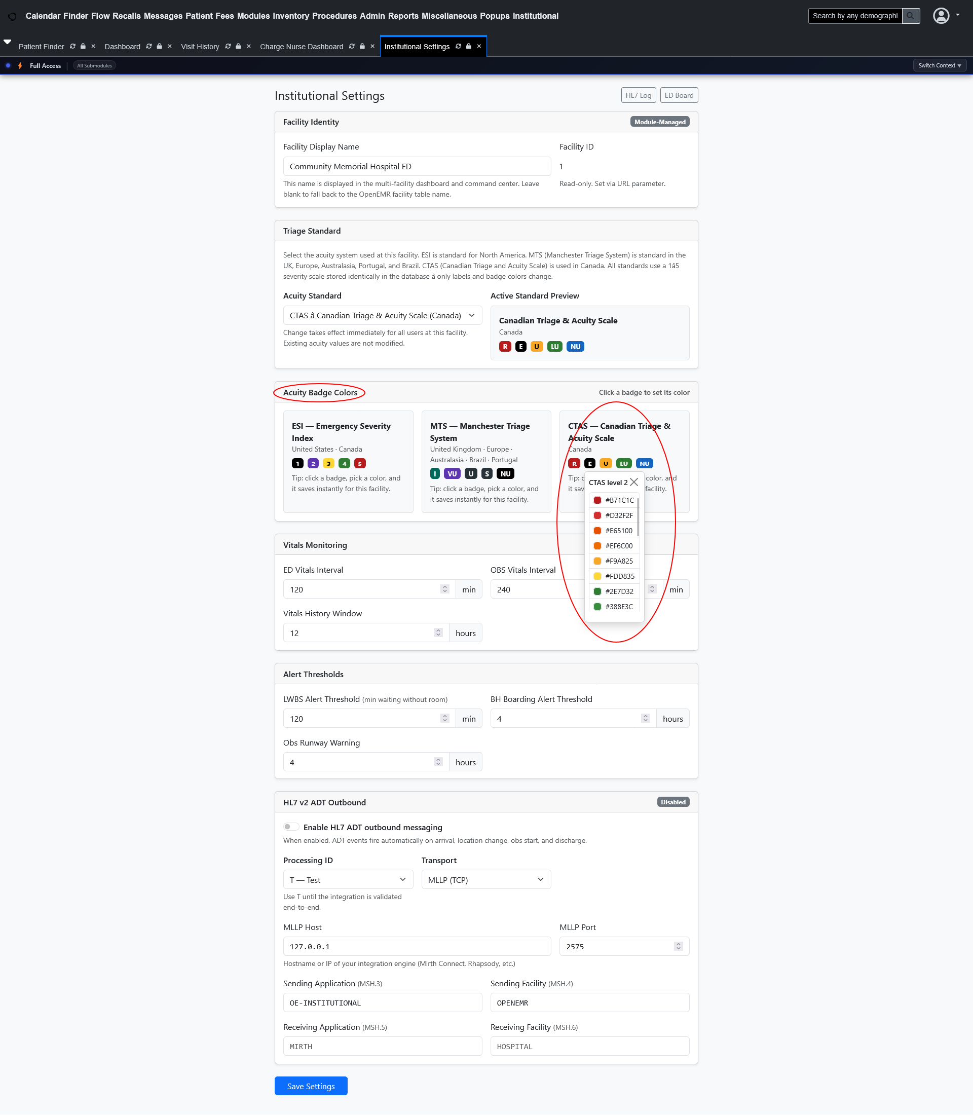 The OpenEMR Institutional Workflow Module is a purpose-built clinical operations extension for OpenEMR, the world’s most widely deployed open-source electronic health record system. The module transforms OpenEMR into a fully featured institutional workflow platform capable of managing Emergency Department tracking, inpatient observation stays, behavioral health boarding, medication administration, real-time charge nurse alerting, discharge coordination, and HL7 v2 ADT interoperability — all within a single, manifest-driven, drop-in package.