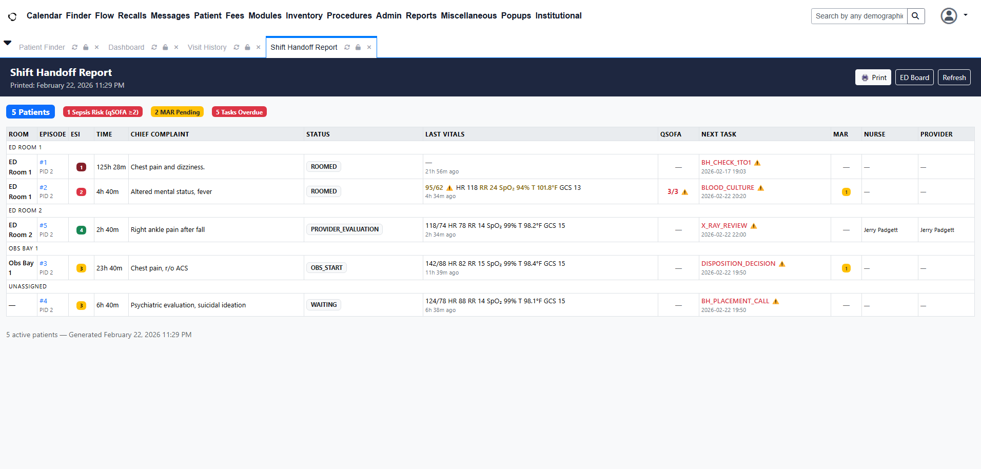 | Shift Handoff | Printable shift change report: room, ESI, chief complaint, status, last vitals, qSOFA score, next task due, pending MAR count, assigned nurse and provider. Print stylesheet optimised for 8.5pt landscape output. | Production |