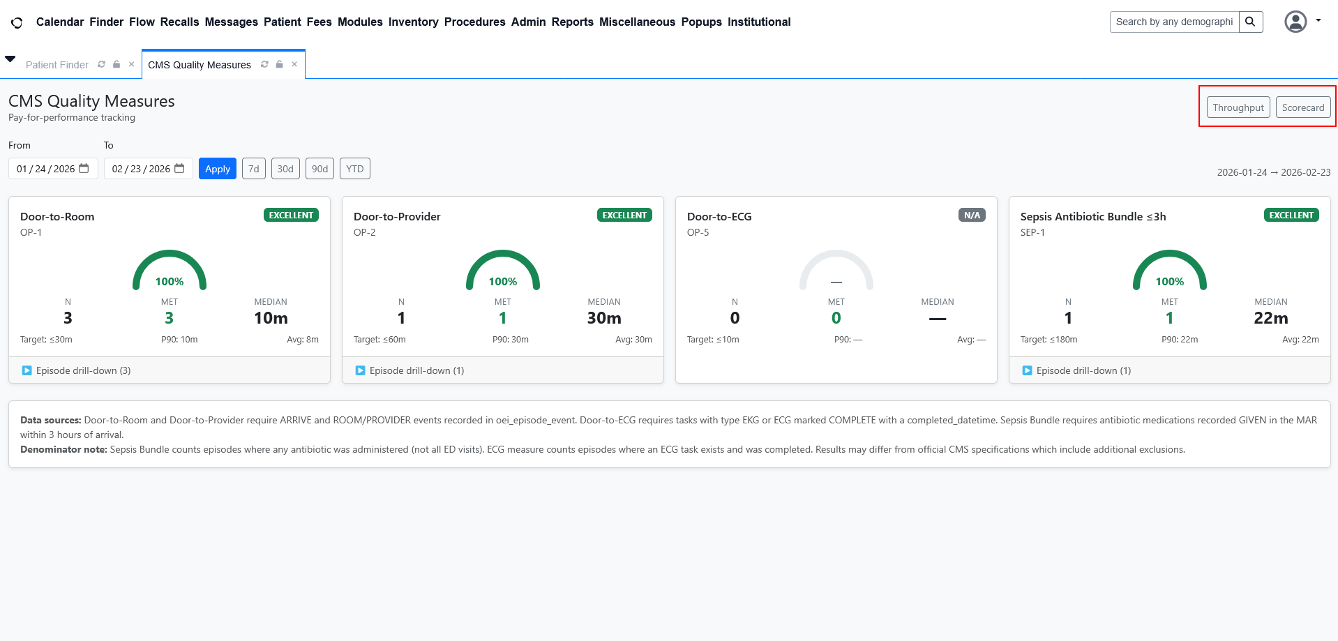 | CMS Quality Measures | Four CMS pay-for-performance measures: Door-to-Room (OP-1, ≤30m), Door-to-Provider (OP-2, ≤60m), Door-to-ECG (OP-5, ≤10m), Sepsis Antibiotic Bundle ≤3h (SEP-1). SVG gauge cards with EXCELLENT/GOOD/FAIR/POOR tier badges. Episode drill-down with met/missed breakdown. No new tables required. | Production |