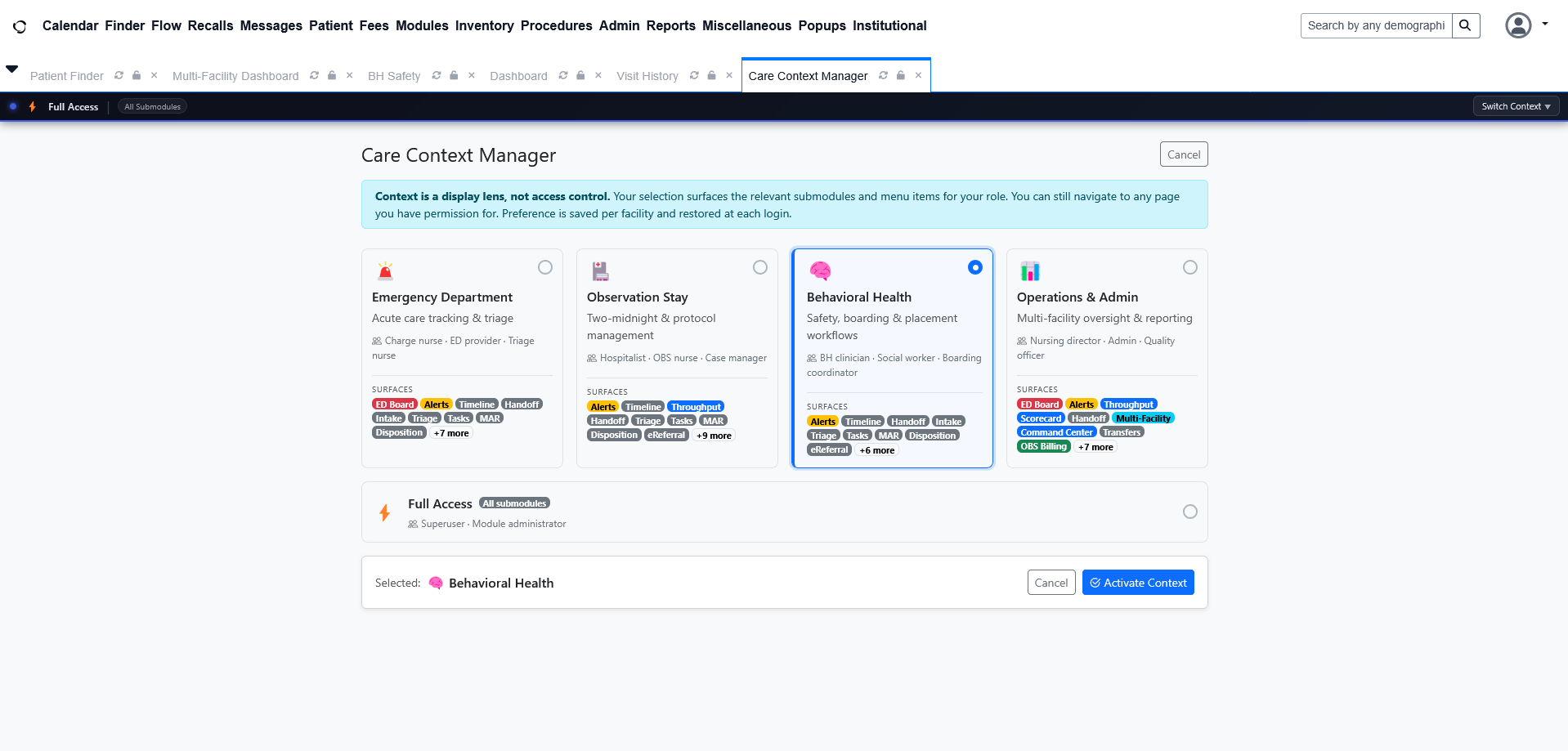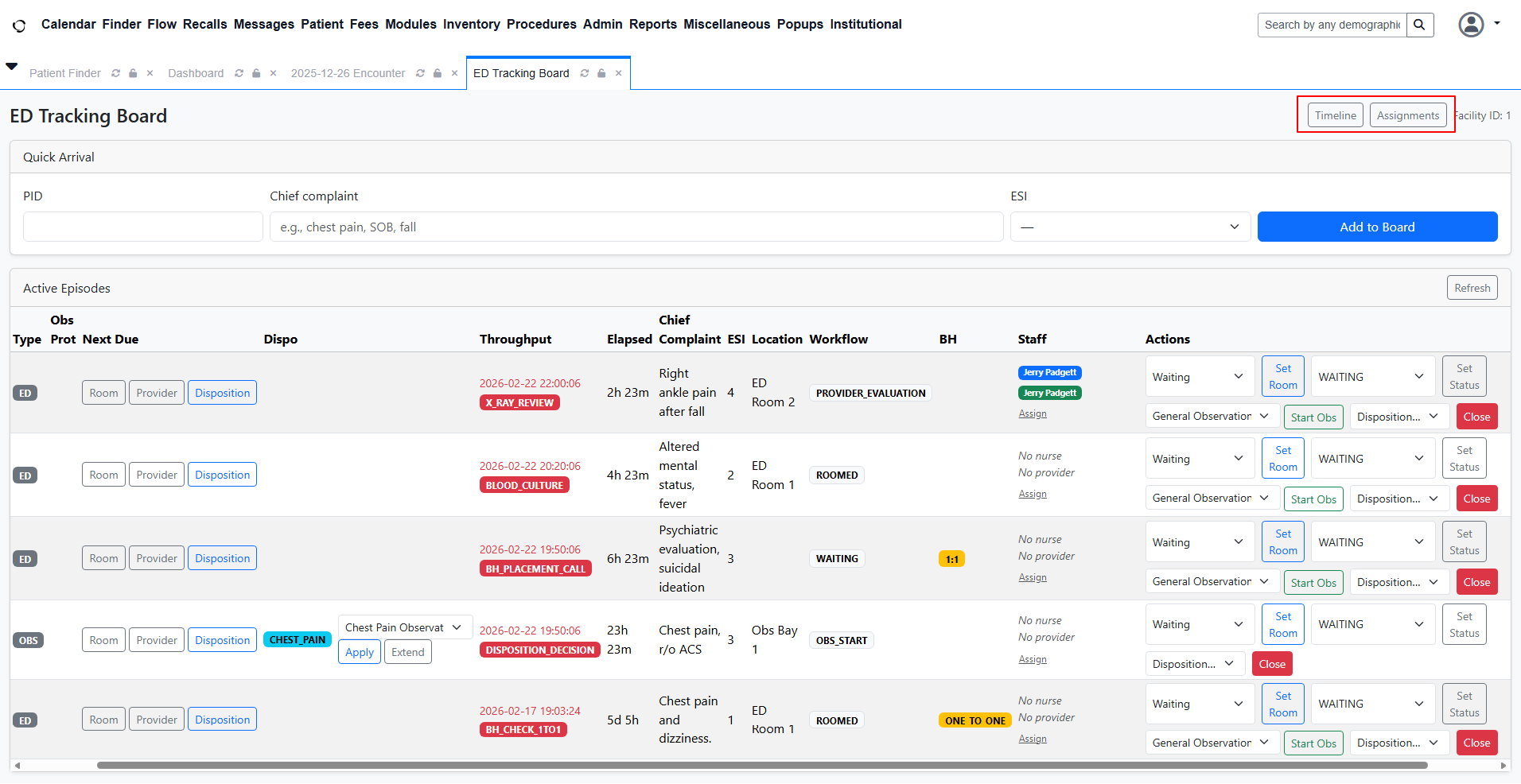 | ED Tracking Board | Real-time episode board with arrival stamping, location assignment, status workflow (Waiting → Roomed → Provider → Results → Ready Dispo → Obs → Closed), BH safety quick-set, obs start with protocol picker, and disposition close. | Production |