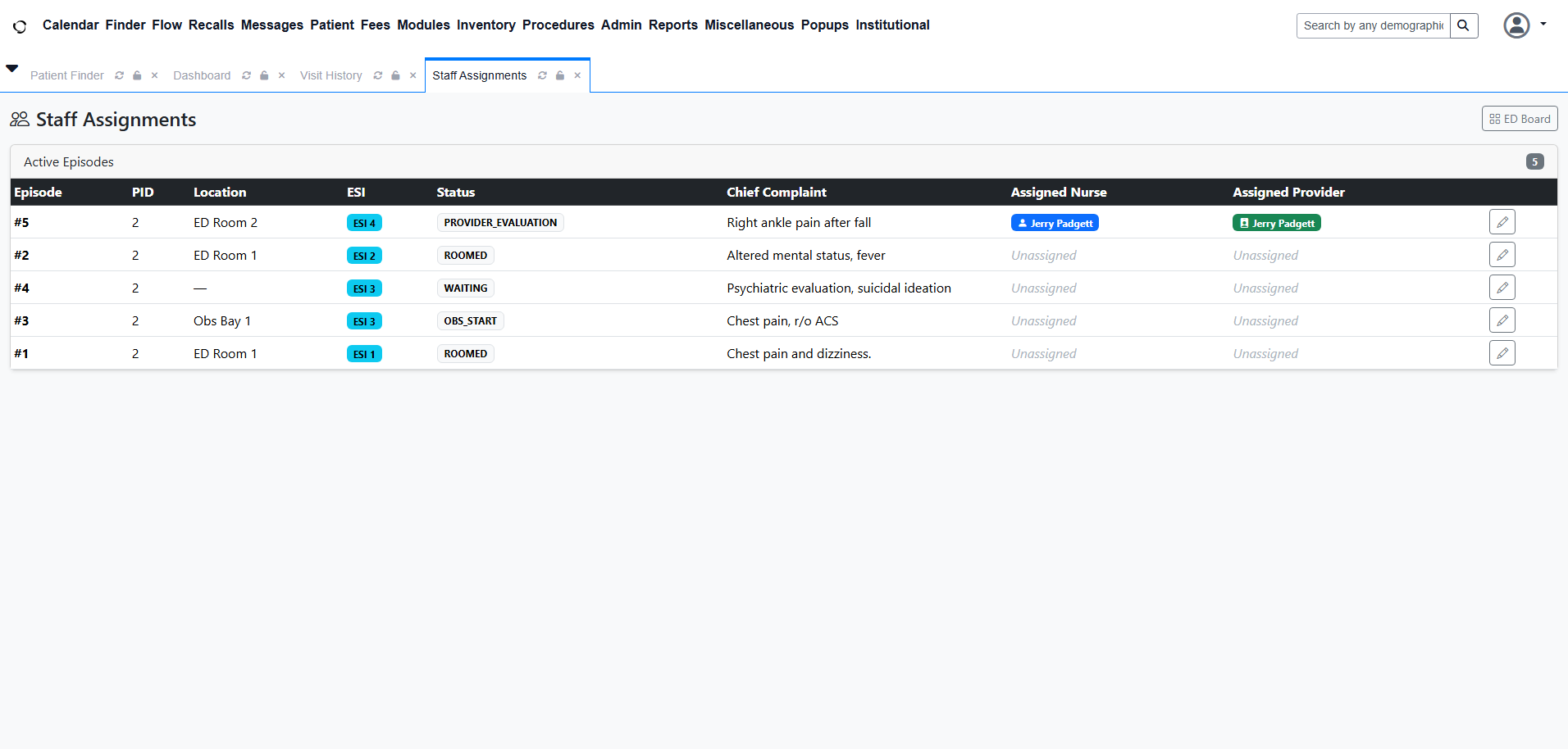 | Staff Assignments | Nurse and provider assignment per episode. Quick-assign dropdown on ED Board. Assignments management page with JSON endpoint for inline editing. | Production |