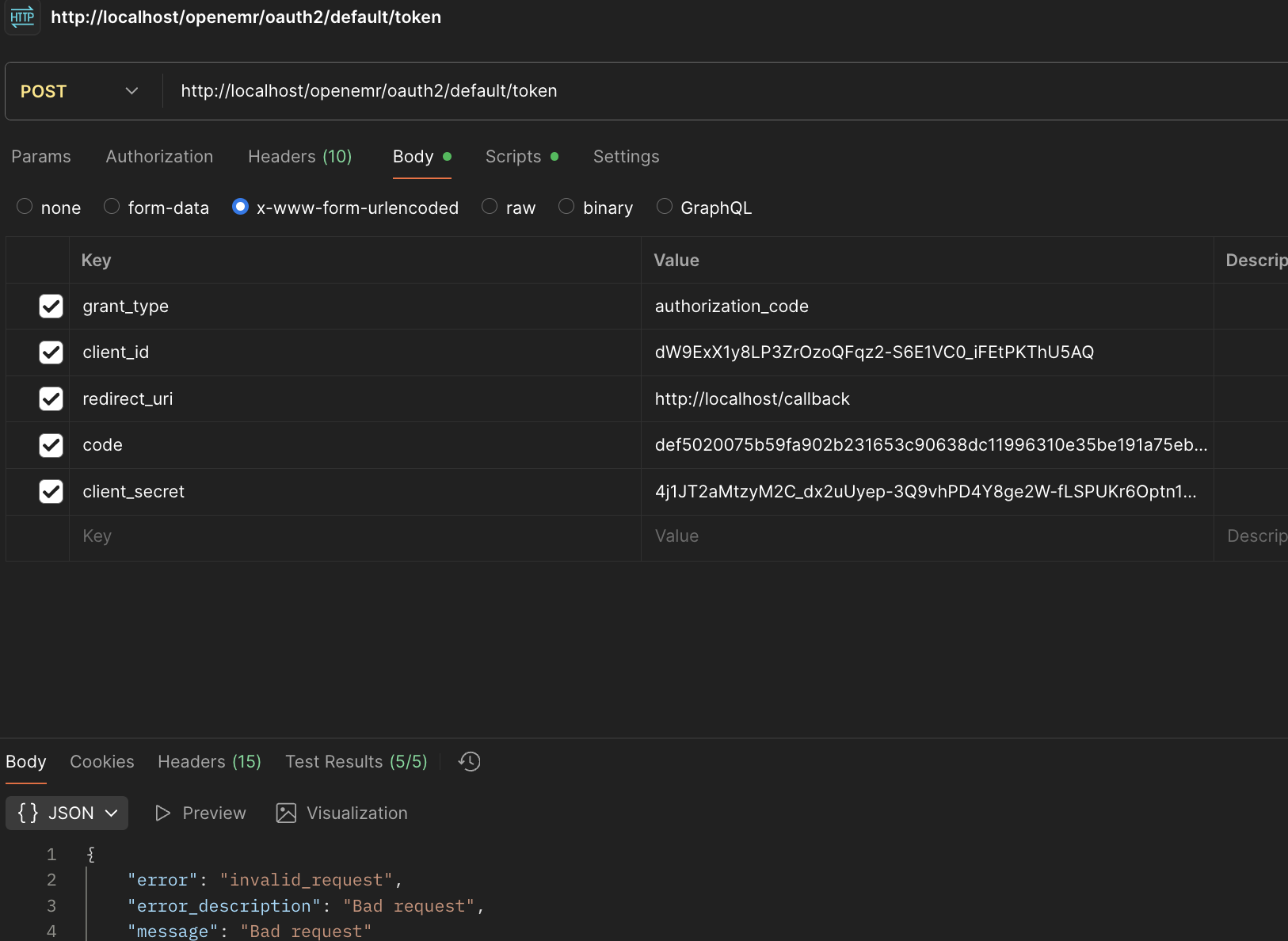endpoint in OpenEMR, but I consistently get a 400 Bad Request