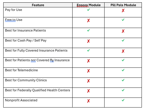 - The Ensora Module is based off a “pay per subscription” model. Pill Pals Module offers e-prescribing at no cost (FREE).