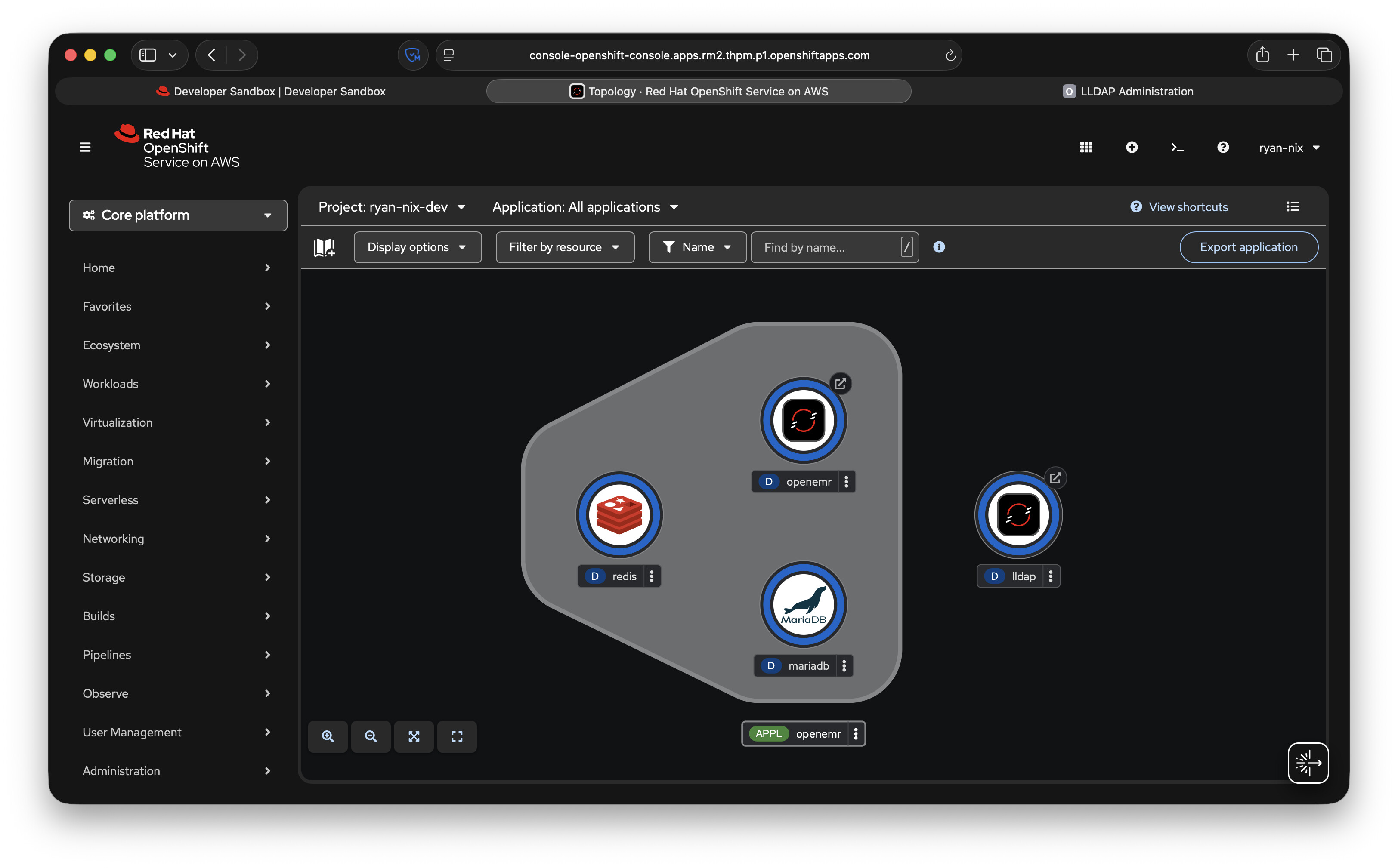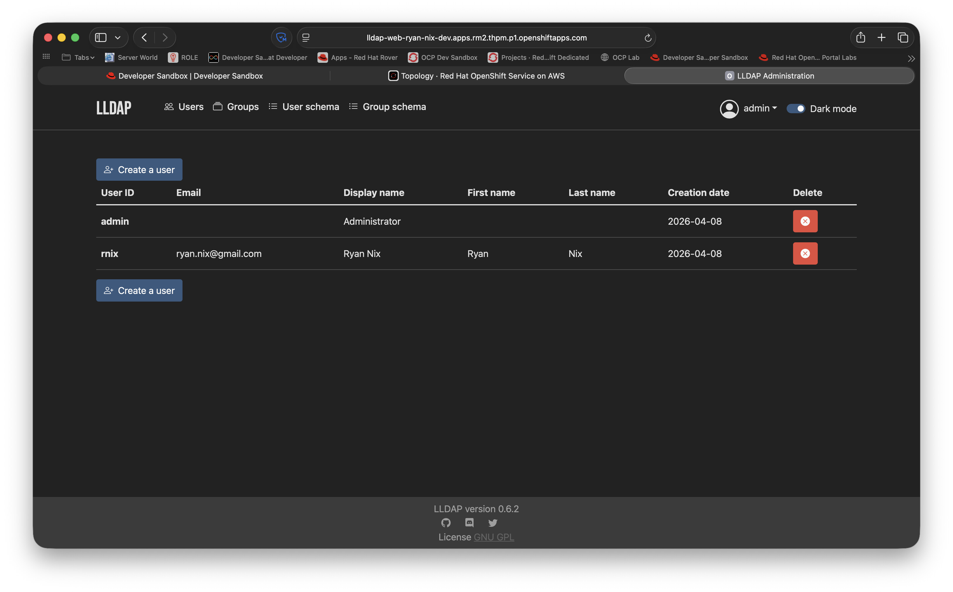 openldap-servers was removed from RHEL 8 and all downstream distributions. Getting OpenLDAP running under OpenShift’s restricted Security Context Constraints is a significant challenge — it requires runtime chown and gosu calls that the restricted SCC won’t allow. lldap’s binary runs natively as an arbitrary UID with no privilege escalation needed, and it includes a web UI for managing users without any LDIF files or command-line tools.